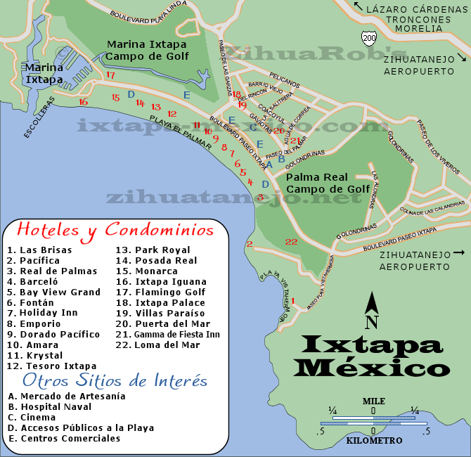 If you have Google Earth installed on your computer then click the following link for a fly-by tour of the Zihuatanejo-Ixtapa area. You can pause the tour at any time to explore any area. Clicking on the place names on the map will provide descriptions of each place.